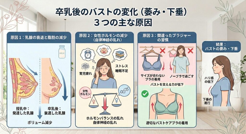 ケアを効果的に行うためには、まず原因を知ることが大切です。卒乳後に胸が萎んだり垂れたりするのには、明確な理由があります。