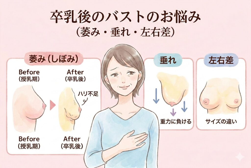 卒乳後、胸には人それぞれ様々な変化が起こります。特に多く見られるのが、胸の「萎み(しぼみ)」と「垂れ」です。