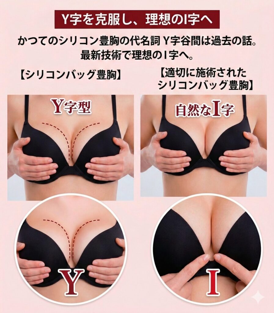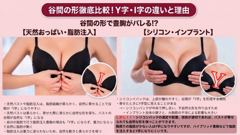 - 寄せた時のY字型の谷間:胸を寄せた際、本来は直線的なI字になりますが、インプラントが硬かったり大胸筋の拘束が強かったりすると、上部がハの字に開きY字に見えることがあります。