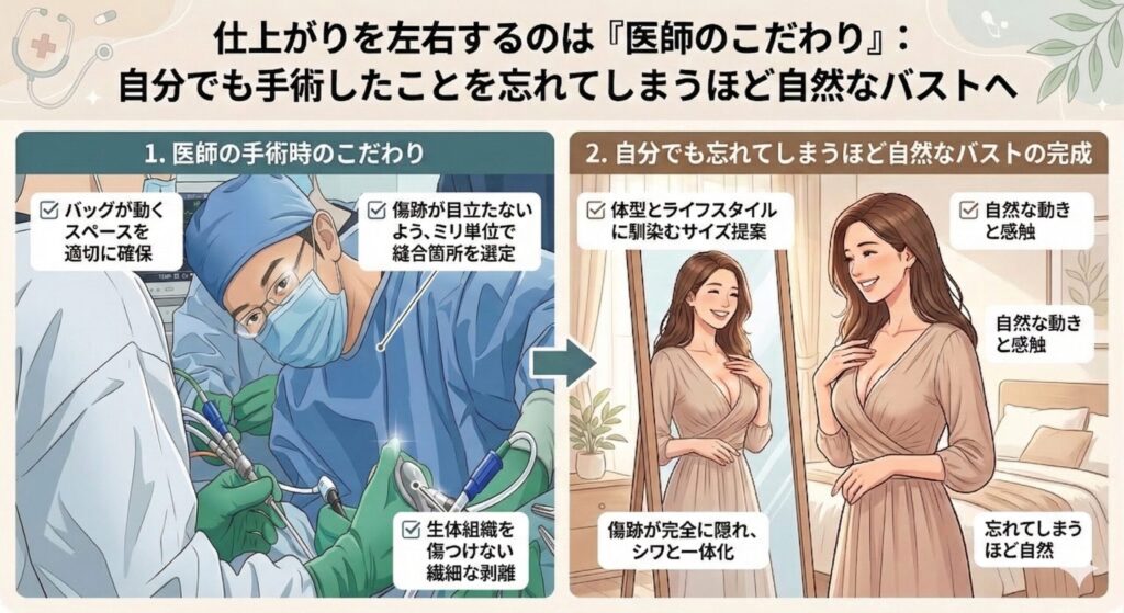 これらを徹底することで、初めて「自分でも手術したことを忘れてしまうほど自然なバスト」が完成します。
