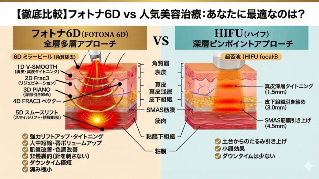 「レーザー界のフェラーリ」と称されるこの最高峰マシンは、他の治療法と何が違うのでしょうか。本記事では、フォトナ6DとHIFU(ハイフ)、高周波、Needle RF、レーザーフェイシャル、テノールといった人気治療法を、ターゲット層、効果、痛み、ダウンタイムなどの観点から徹底比較します。