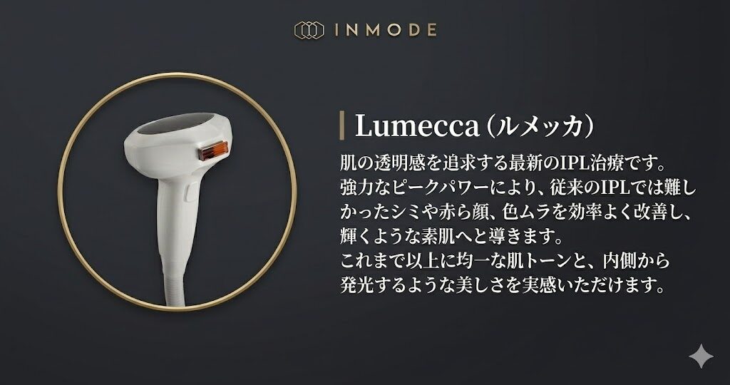 肌の透明感を追求するIPL(強軸光)治療です。ルメッカは従来の機器を凌駕する高いピークパワーを誇り、シミやそばかす、赤ら顔、毛細血管の拡張といった肌の「色」に関する悩みに効率よくアプローチします。光エネルギーがメラニンや血管に働きかけることで、肌全体のトーンを均一に整え、内側から発光するような明るく健康的な素肌へと導きます。これまで反応しにくかった薄いシミに対しても、高い効果が期待できるのが特徴です。