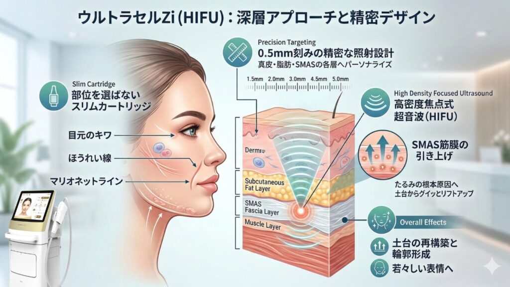 最新機種であるウルトラセルZiは、照射深度を0.5mm刻みで細かく設定できるよう進化しました。患者様の骨格や脂肪の厚みに合わせ、SMAS筋膜・脂肪層・真皮層の各層へ、よりパーソナライズされたアプローチが可能です。