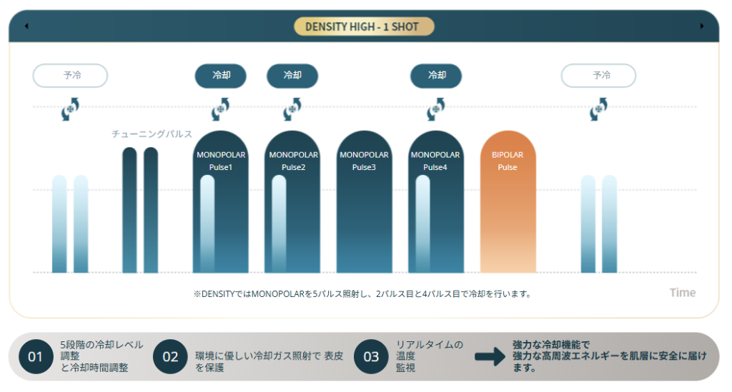 デンシティには、毎ショットごとに肌の抵抗値を測定するリアルタイム・インピーダンス・チェック機能が搭載されています。照射のたびに抵抗値を測定し、システムにフィードバックすることで、常に適切なエネルギー量へと自動調節されます。これにより、どの部位に対しても正確でムラのない照射が可能となり、火傷のリスクを最小限に抑えつつ、最大限の効果を引き出すことが可能になりました。