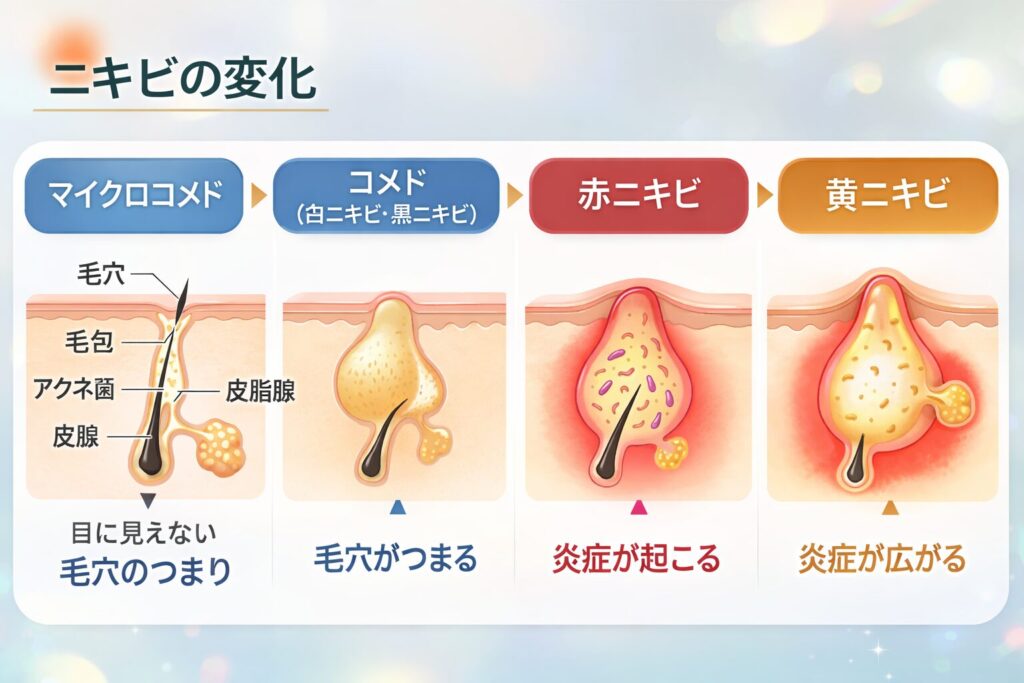 ニキビは次のような段階で進行します。