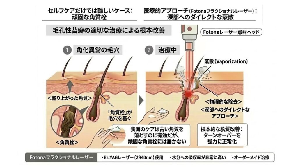 一方、Fotonaフラクショナルレーザーによる治療は、セルフケアでは不可能な「物理的な除去」「深部へのダイレクトなアプローチ」を可能にします。