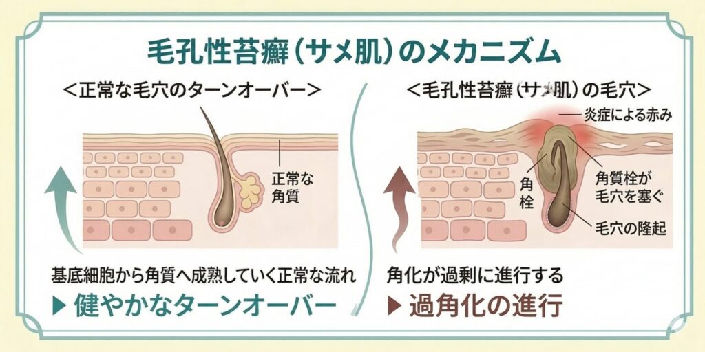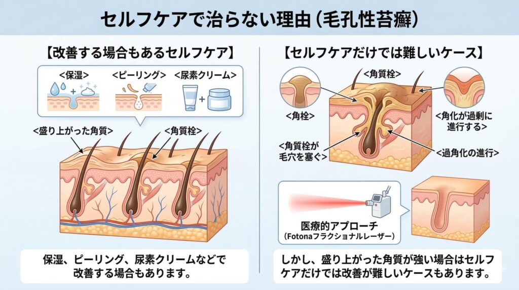 市販の尿素クリームやピーリング剤は、あくまで「肌の表面(角質層の上層)」を柔らかくし、手触りを一時的に改善するためのものです。しかし、毛孔性苔癬の正体は、毛穴の奥深くまでガッチリと詰まった「角質栓」です。