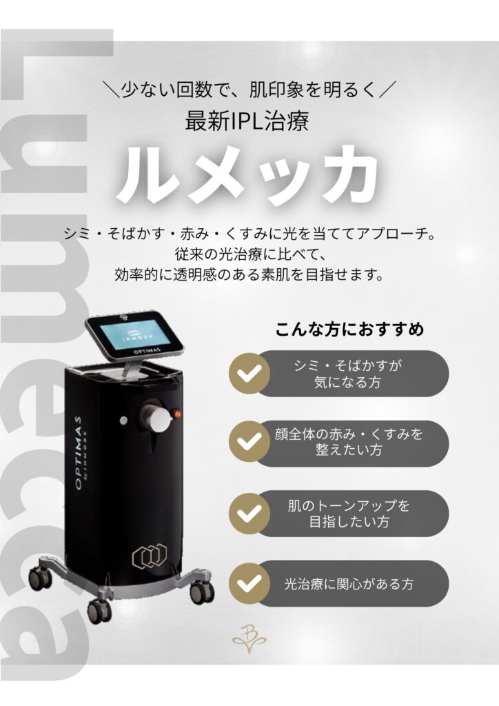 ルメッカは、通常のIPL機器の約3倍のピークパワーを持ち、500〜600nmの波長帯にエネルギーを集中させた高効率な光治療です。メラニン(シミ)やヘモグロビン(赤ら顔)に選択的に吸収され、表在性色素斑・毛細血管拡張・肌質の改善に効果があります。