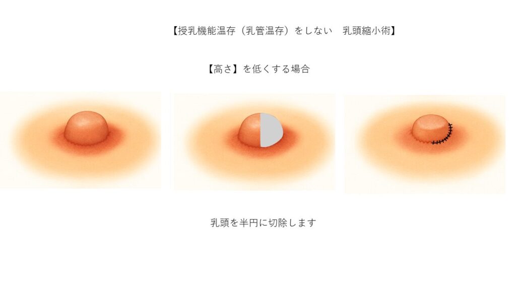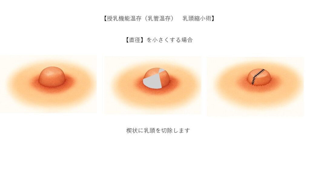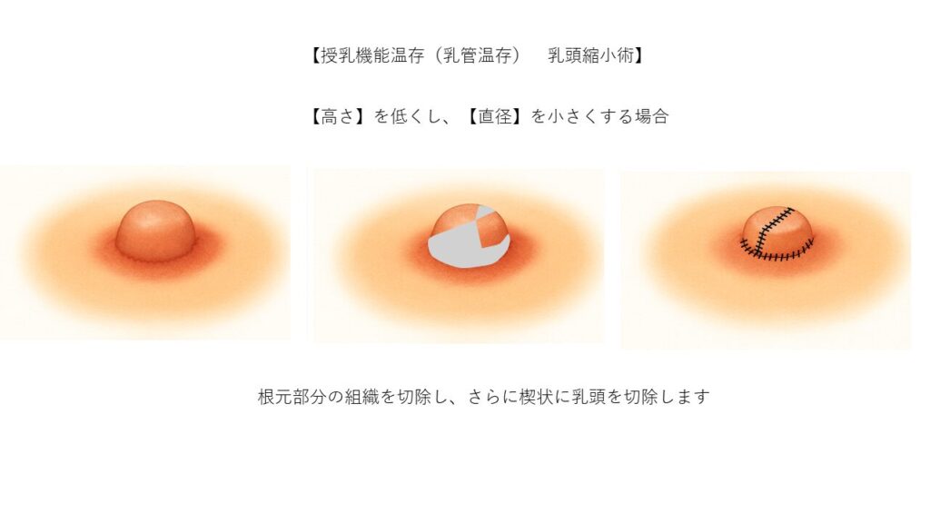 この方法では、将来的な授乳を考慮し、乳頭内部の乳管を温存します。余分な皮膚や組織だけを丁寧に除去し、目立ちにくい部位に縫合することで、自然な仕上がりと目立たない傷跡が期待できます。