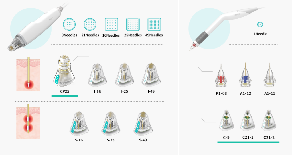 Sチップは、極細の針で小さな穴を開けてから、肌の内側に高周波を照射するため、コラーゲンやエラスチンといった肌に必要な成分が作られやすくなります。そのため、肌のひきしめ、毛穴やリジュビネーションに効果的です。また、真皮層にある毛細血管に高周波を照射し、血管の分岐を抑え新しく毛細血管が作られるのを防ぐため、肝斑や紅潮、くすみにも効果的です。Iチップはシワやアクネ、挫創に効果的です。